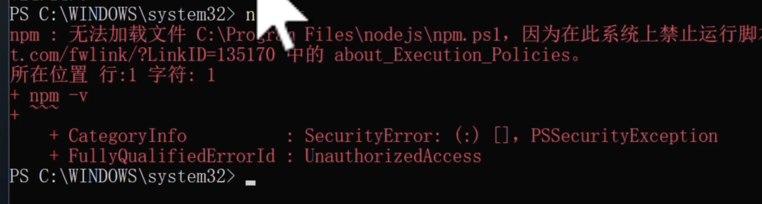 其实这个报错原因很简单:Windows 系统为了防止电脑中病毒,默认就 “锁死” 了所有脚本文件的运行权限(包括 npm 要用到的脚本)。咱们只要简单修改一下系统权限。