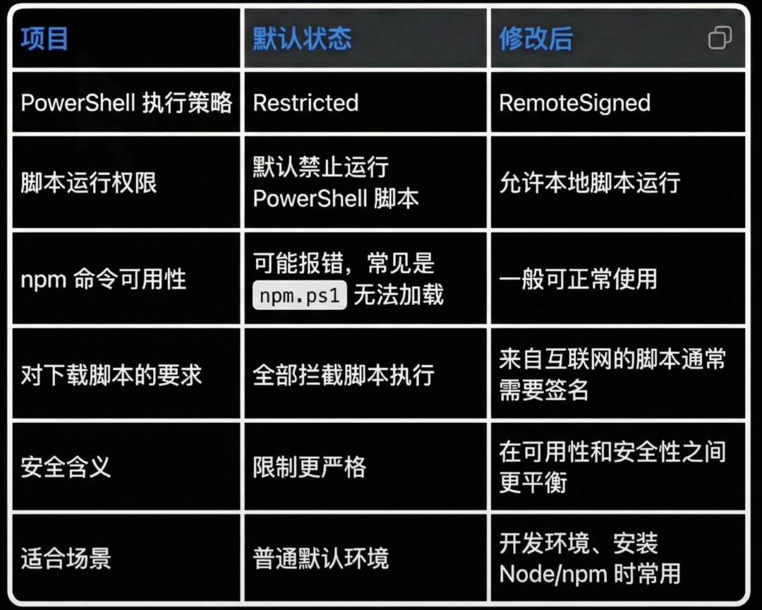 接着输入:Set-ExecutionPolicy RemoteSigned(这行指令就是把系统的安全规则改成 “允许本地的脚本运行,外来的陌生脚本仍要验证”—— 既不影响咱们用 npm,又能保证电脑安全)